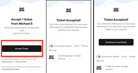 Tap Accept Ticket and you’ll receive a confirmation once the tickets have been successfully added to your SeatGeek account.