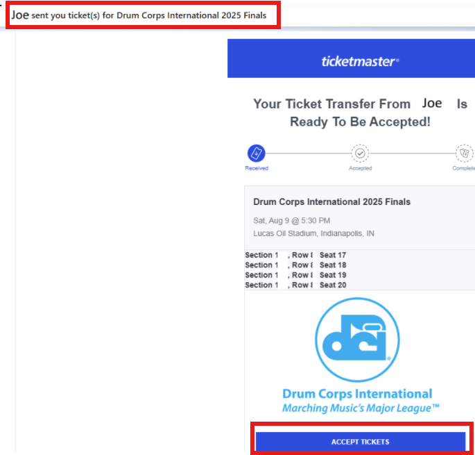 "John sent you tickets" (this includes the sender’s name).Open the email and click the “Accept Tickets” button.